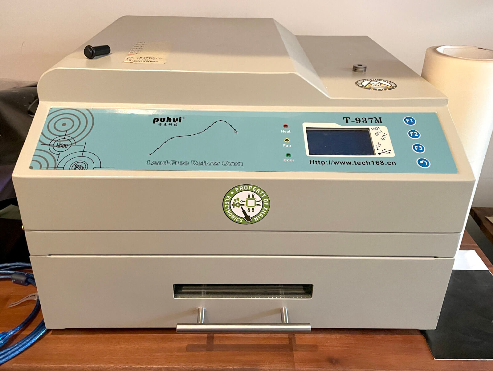 The reflow oven is a Puhui T-937M which uses infrared for heating. It supports boards up to 290x375mm and a maximum operating temperature of 350°C. Though generally boards larger than 100x100mm require extra configuration, to avoid inclomplete reflow and are thus not recommended.